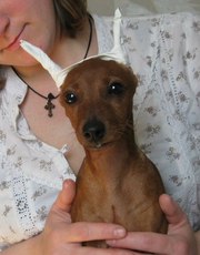 СПб...Ждет своих хозяев яркая рыжая девочка. Очень ласковая, игривая, активная, сообразительная. Полностью привита. Купированы хвост и уши. Гуляет. Пинчер- это собака-компаньон небольшого (до 30см) роста.